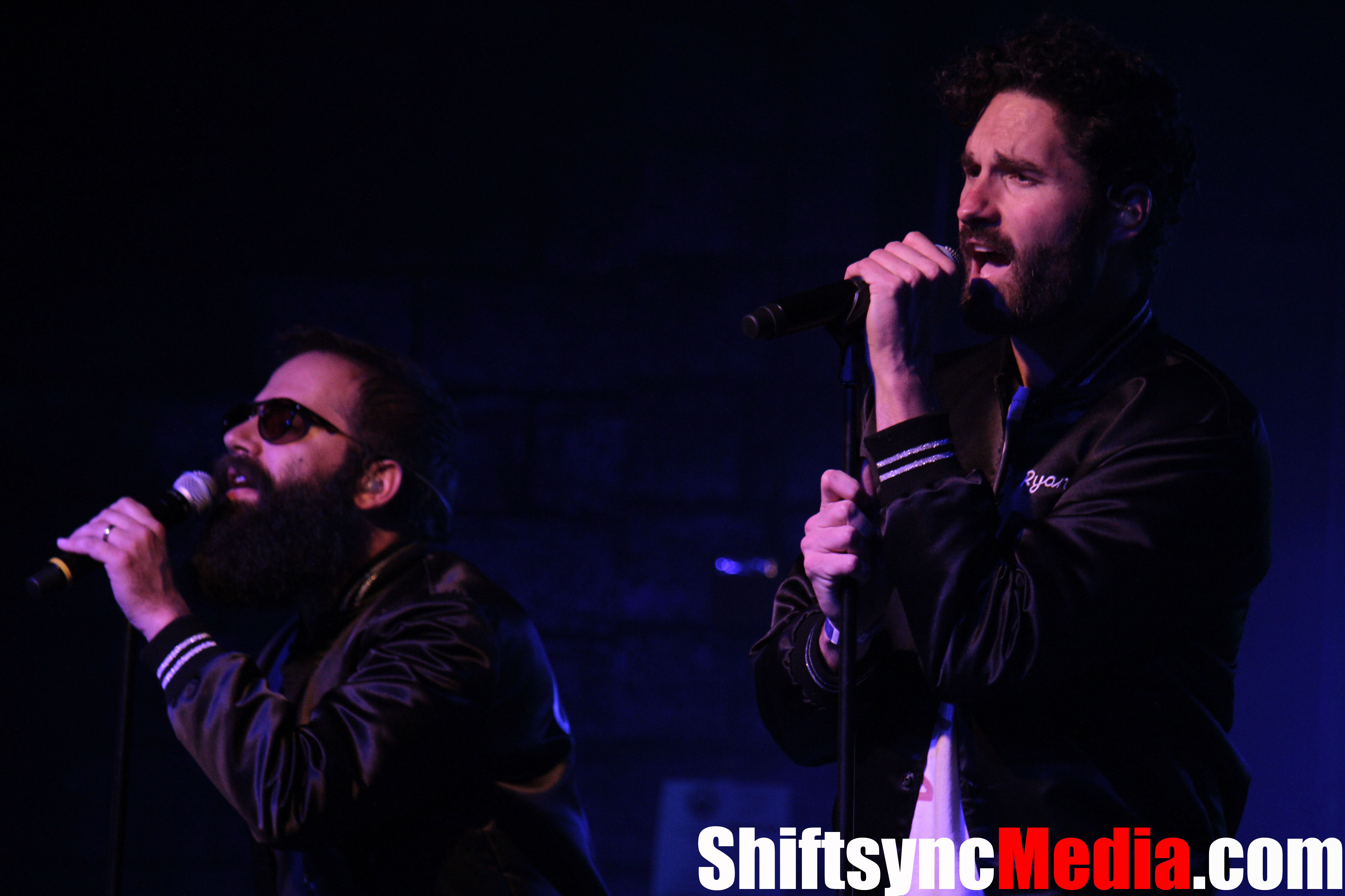 Ryan Merchant right, and Sebu Simonian left both lead vocalists for Capital Cities singing to their audience at the Ace Of Spades Venue in Sacramento, CA