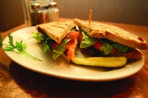 A Grilled Salmon B.L.T. sandwich on a dinner plate with a pickle and a garnish from Cafe Bernardo in owntown Sacramento.